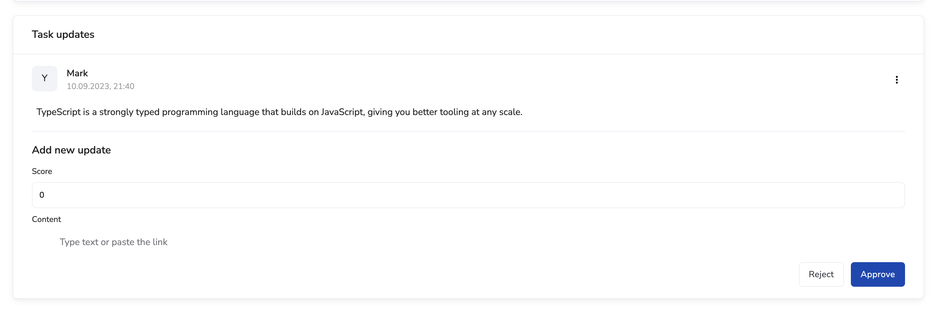 To send feedback to the participant, if necessary, you can add content and a score and click the Reject or Approve button.